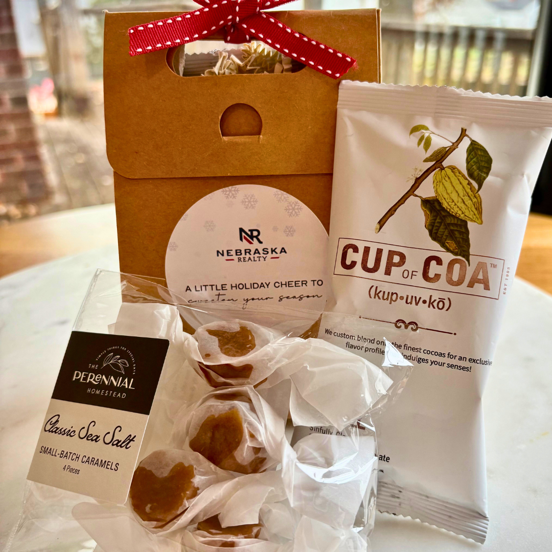 The Cozy Cheer Pop-By includes locally made caramels and a warm gourmet cocoa blend.