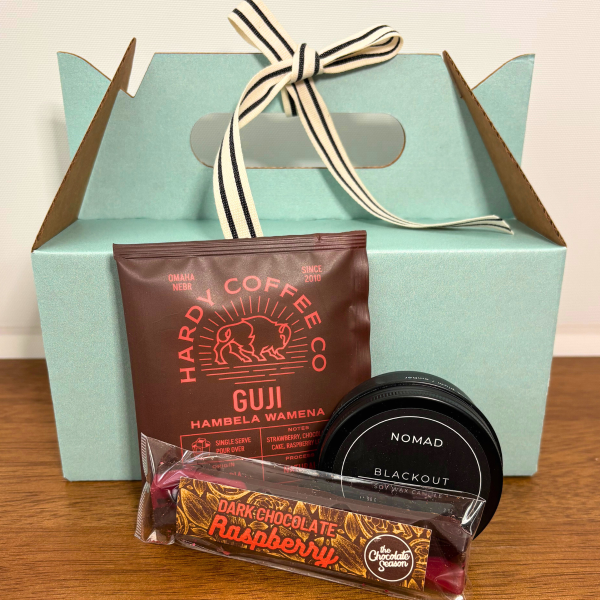 Moody, rich, and indulgent. A bold pairing of dark chocolate, specialty coffee, and a deep-scented candle for a sophisticated gifting moment.